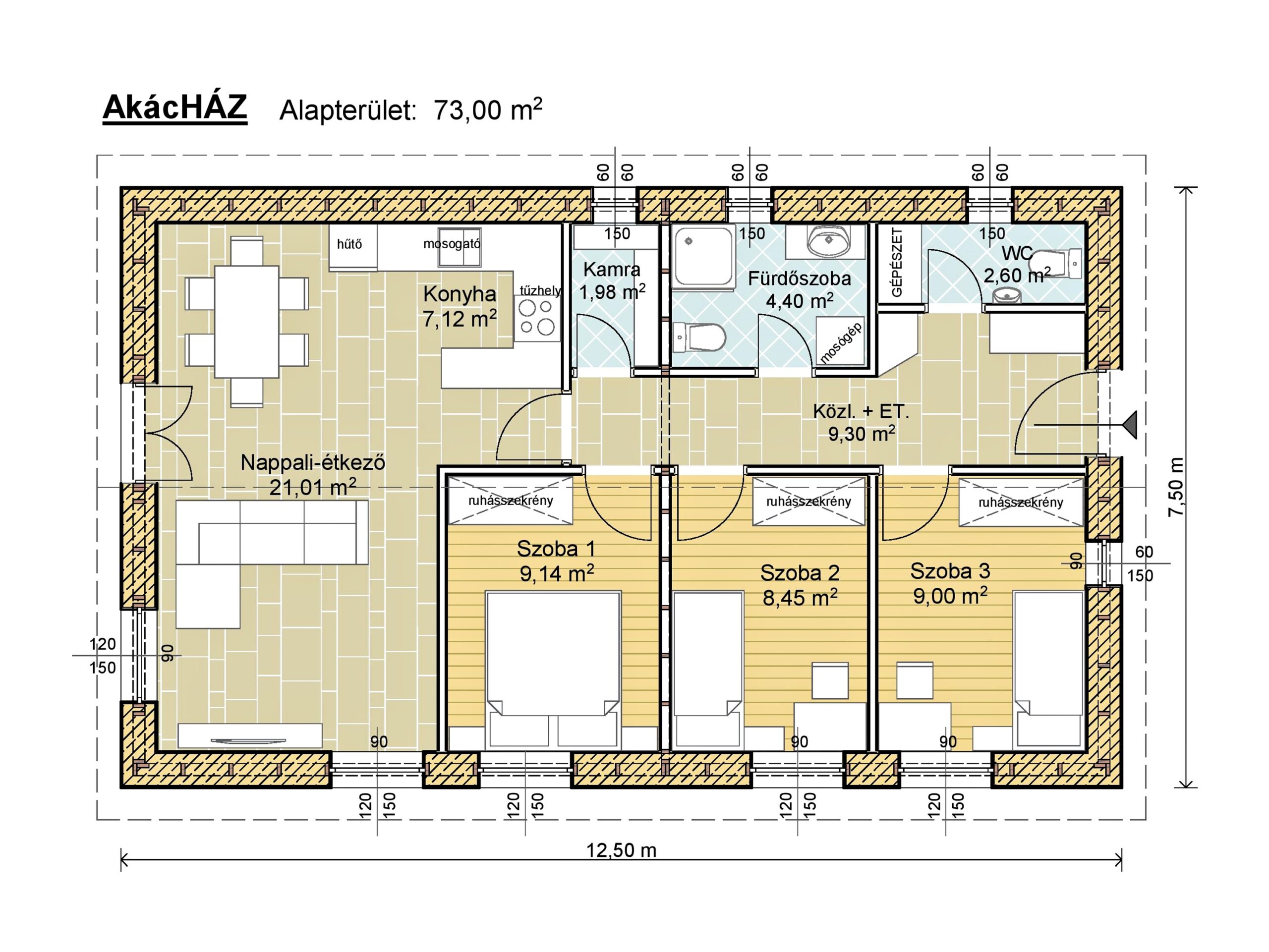 Gépészet és közlekedő terek (9,30 m²) – A jól szervezett közlekedő biztosítja az optimális térkapcsolatokat.