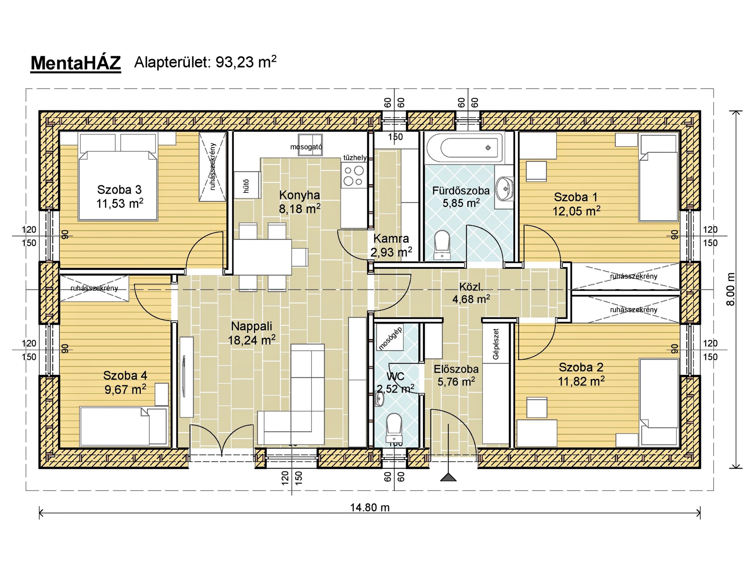 A 93,23 m² hasznos alapterületű MENTA Kendercell mintaház terve jól átgondolt, praktikus térszervezési elvek mentén készült, amely megfelel a modern családi élet követelményeinek. Ennél a tervnél a CSOK kedvezményt igénybe vevő nagycsaládokra is gondoltunk, hogy a szülőknek és a gyermekeknek külön lakóterük is legyen. Az épület kialakítása a következő fő funkcionális szempontokat követi.